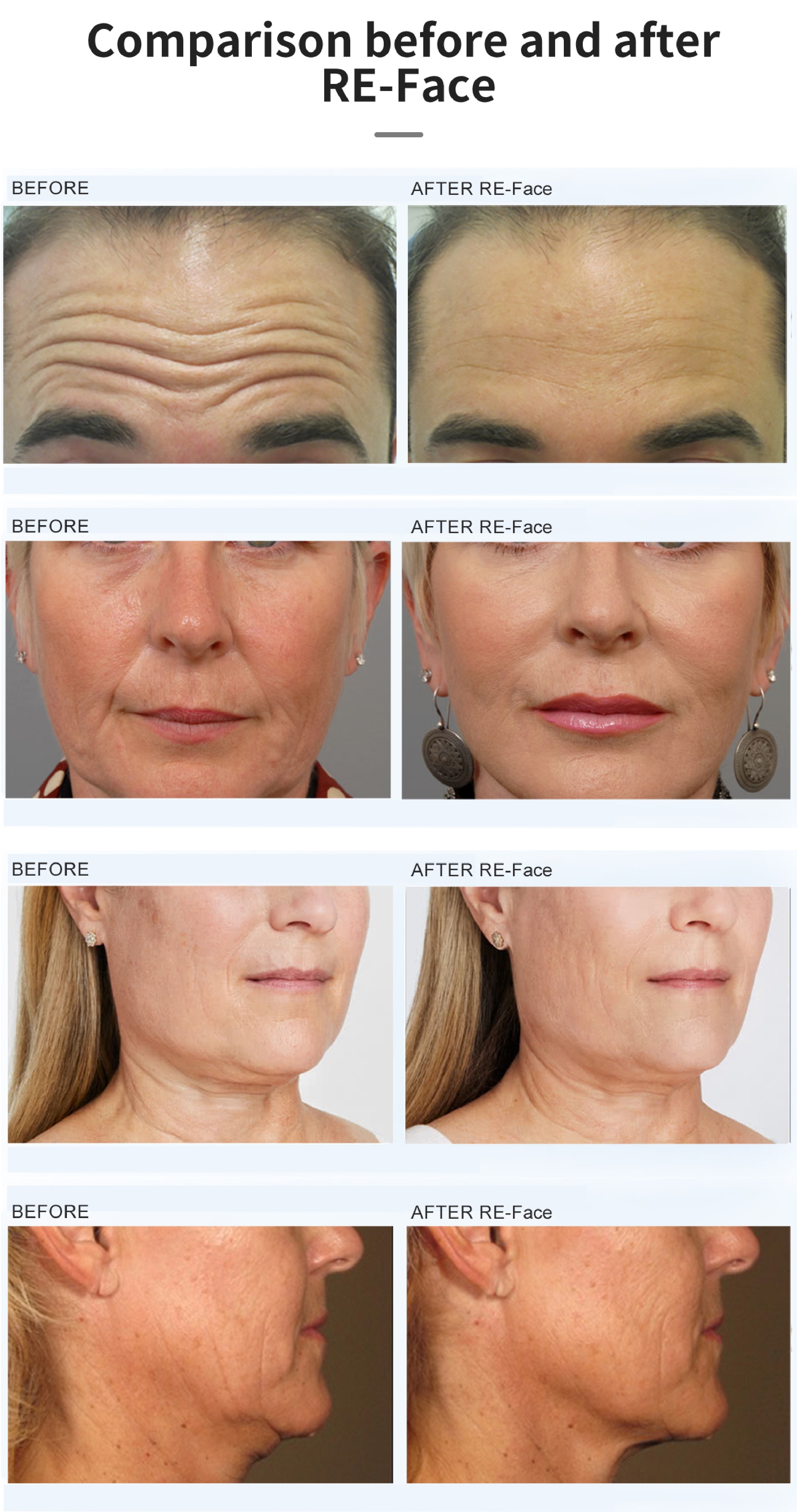 Visible improvement can be seen after 1-3 sessions. RET-Face effectively reduces forehead lines, smile folds, and sagging skin.