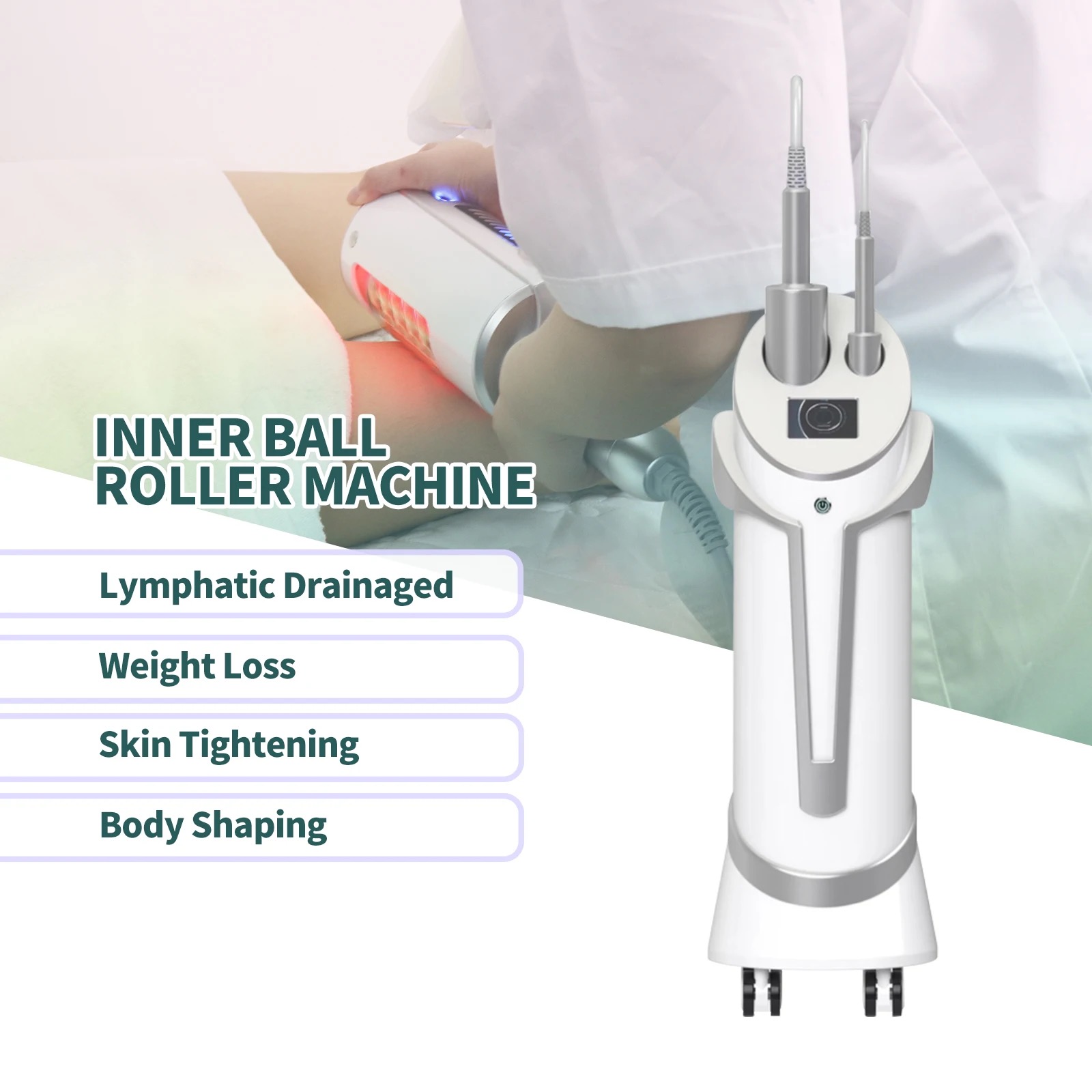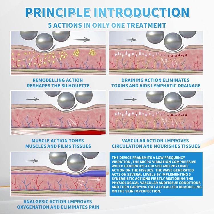 The inner ball roller machine, which uses an innovative compression micro-vibration technology. This technology is realized by a 360° intelligent rotating cylindrical roller handle. A roller device composed of 50 silicone balls in the larger handle, used for body care; another roller device composed of 60 silicone balls in a smaller handle is used for face/neck care