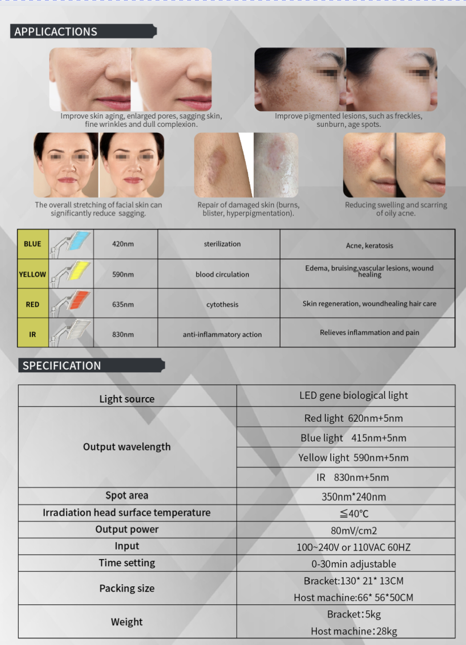 This device is suitable for dermatology clinics, cosmetic centers, and hospitals. Effective in treating inflammatory acne, reducing redness, accelerating wound healing, and promoting overall skin regeneration.
